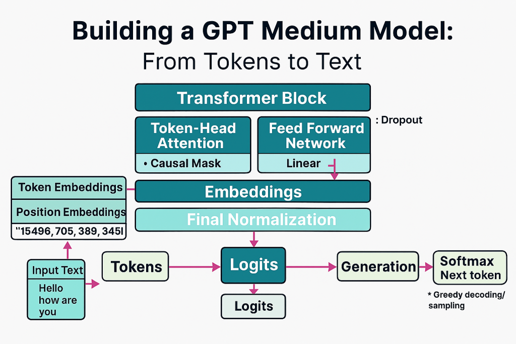 In Part 4, I focused on attention and built reusable modules that mirror transformer internals. In Part 5, I assembled the complete GPT architecture at medium scale, validated shapes and memory, and ran first text generation. The outputs are gibberish because the model is untrained. That is expected.