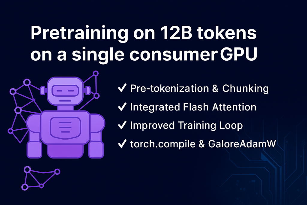 torch.compileusage and runtime flags, mixed-precision considerations, and optimizer selection (GaLoreAdamW). - Run summary and practical lessons from training ~12B tokens on a single 3080 Ti.